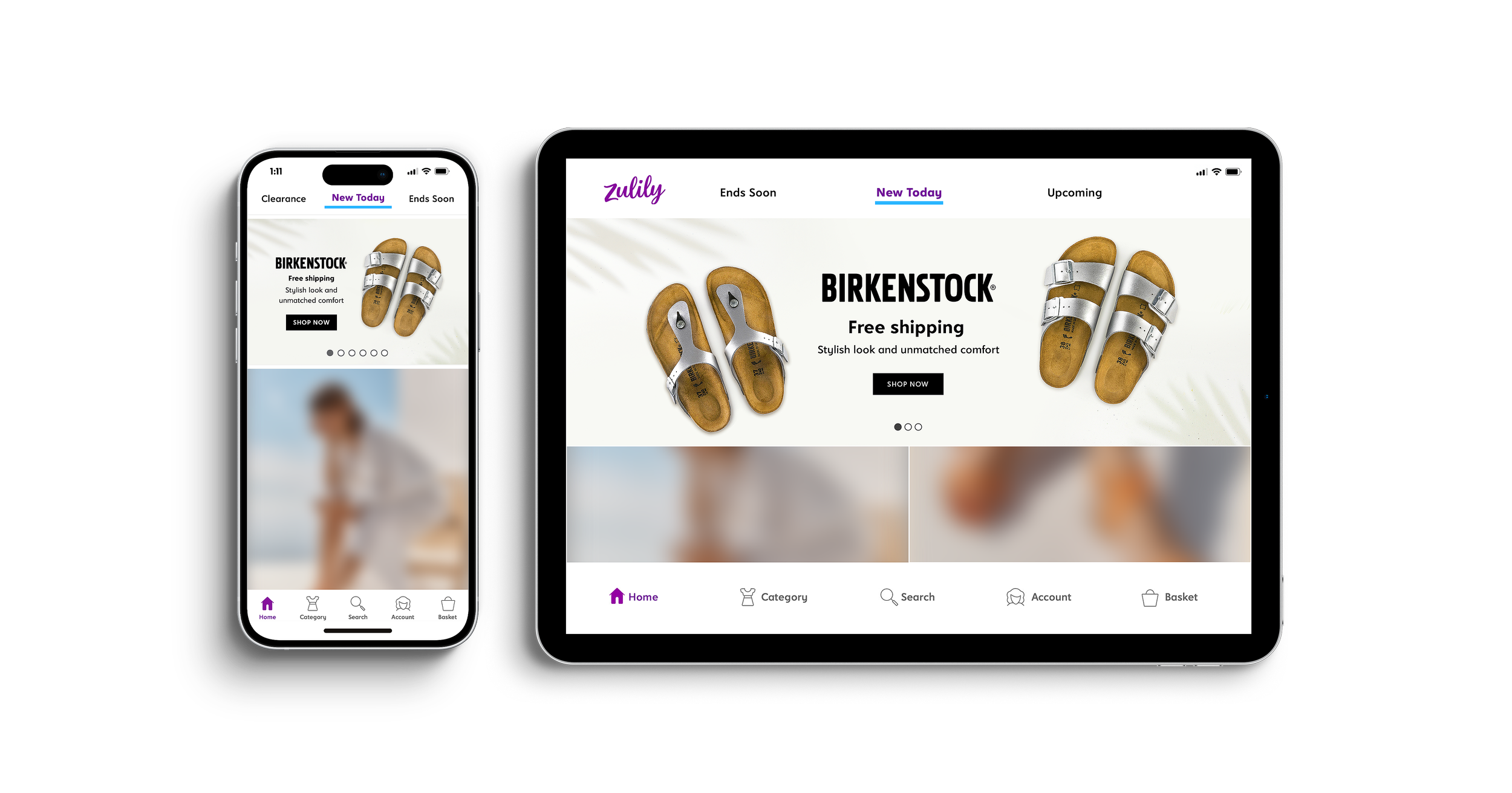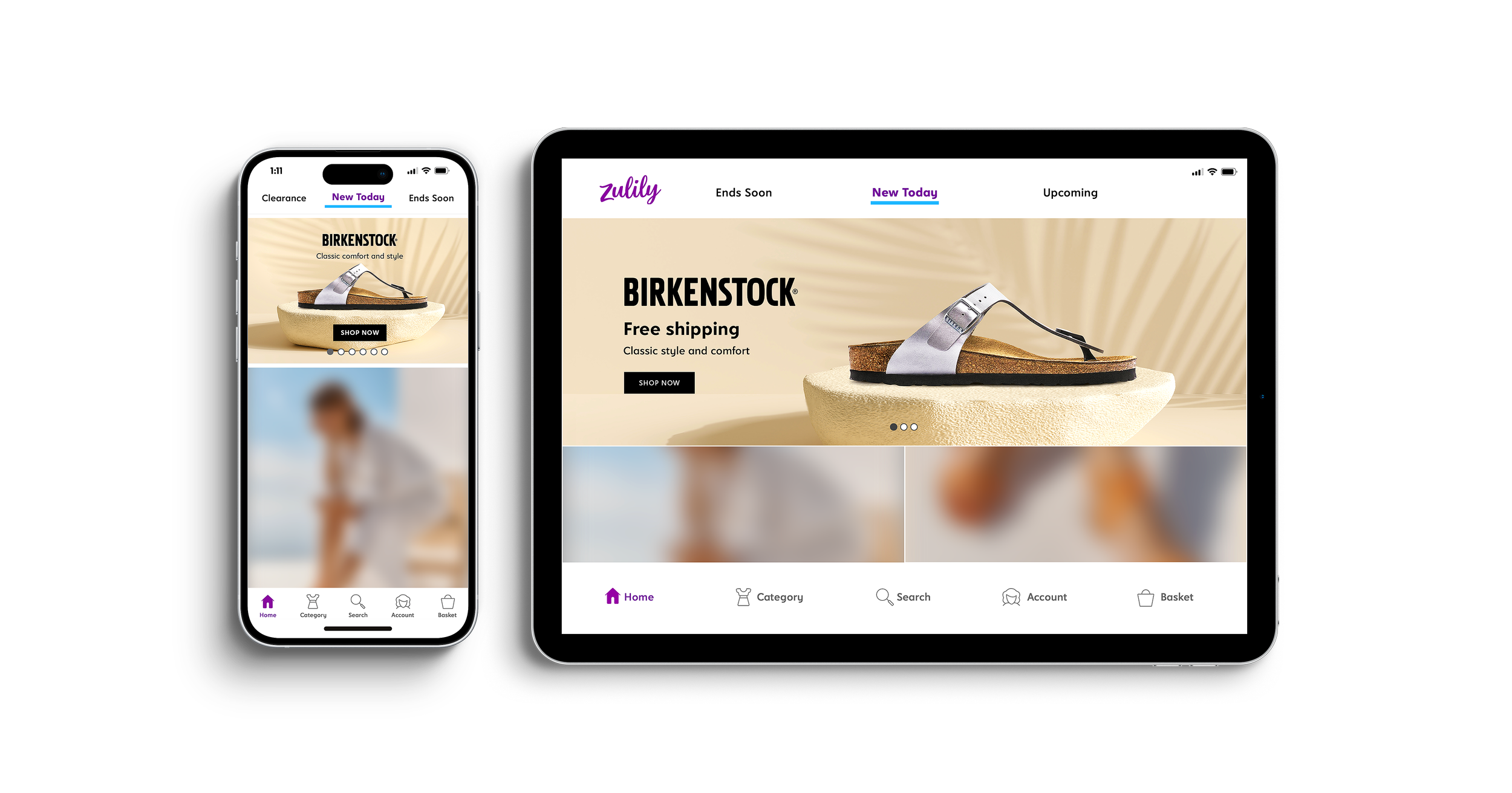 As part of the production design team, collaboration with copy, marketing, and merchandising was key to creating a homepage header that blended Zulily’s and Birkenstock’s brand aesthetics. This project began with only product, no background or art direction, so stock imagery was sourced and retouched to build a scene that fit both brands. Compositing the product into the environment required careful color matching, lighting adjustments, and shadow work.